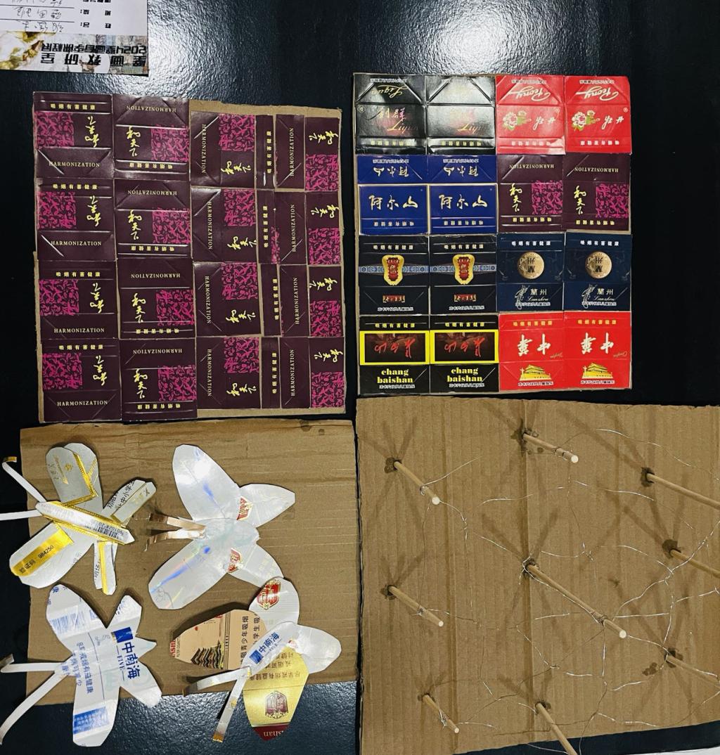 作品材质:烟卡、纸板、筷子、铁丝、纸板、502胶
