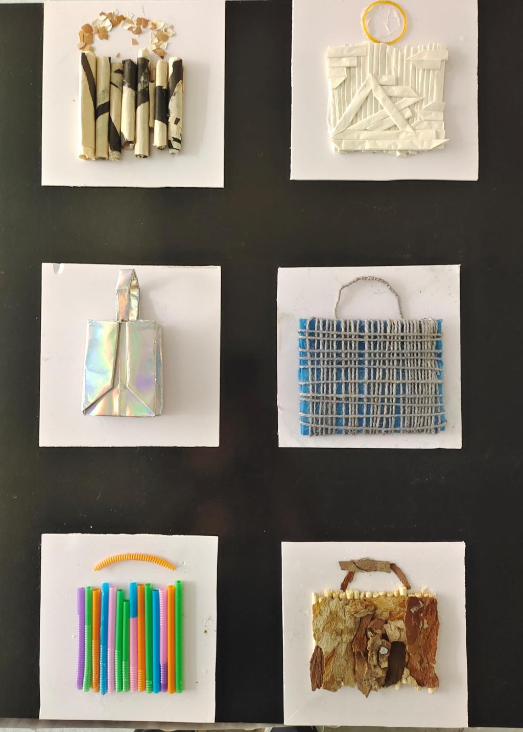 材质:塑料瓶、碎步、木棍、废旧书法纸、胶布、棉线、卫生纸、kt板、酒精胶、废弃书法纸、毛绒布、针线、塑料扣、透明pvc、拉链、纸条