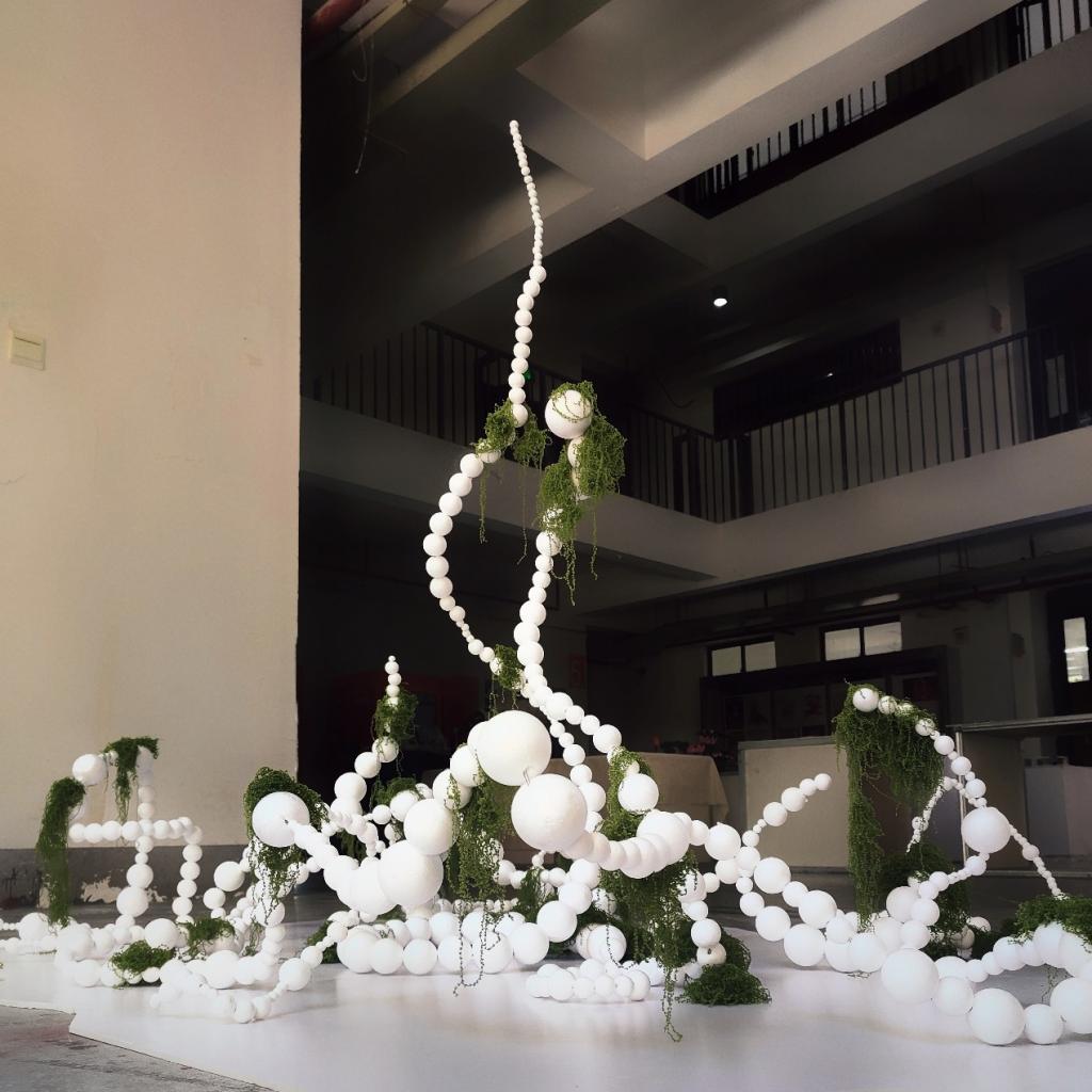 装置艺术《绿脉》是一件以低碳环保为核心理念的装置艺术品,作品以缠绕在一起的曲线脉络形成类似树干的结构,象征着生命的生生不息。白色泡沫球代表着现代社会对能源和资源的大量消耗,而绿色苔藓则象征着环保和生态力量。