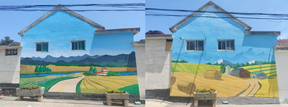 团队成员通过绘制以乡村自然景观为主体的墙绘作品,以体现新时代乡村精神面貌,不仅提升了村庄的颜值,更增强了村民的文化自信。墙绘成为了展示乡村魅力的新窗口,每一幅作品都是对韩家窝村文化的再现,靓丽鲜艳的墙绘吸引了村民们在壁画前驻足观望,游客纷至沓来,成为了当地新的打卡点。