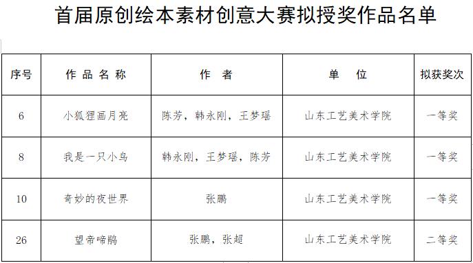 近日,由山东省教育厅主办的首届原创绘本素材创意大赛公布获奖名单。数字艺术与传媒学院师生作品《小狐狸画月亮》、《我是一只小鸟》、《奇妙的夜世界》获一等奖;《望帝啼鹃》获二等奖。
