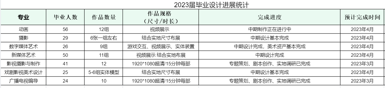 本学期已接近尾声,但毕业生的教学工作仍在继续。2023届毕业生共251人,除摄影专业为个人创作外,其余专业皆为小组合作。各专业毕业生导师定期跟进毕业设计进度,督促毕业生利用假期时间完善设计创作。