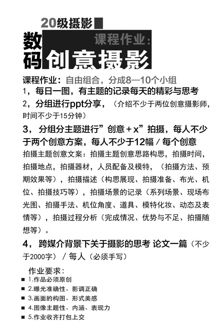 4.以“跨媒介背景下关于摄影的思考”为题不少于2000字的论文/每人。