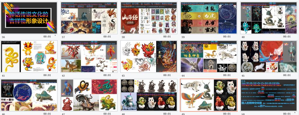 神话传说文化的吉祥物又称之为吉祥神,介绍了神话传说文化都是人们幻想出来的、或传闻、或听说等,一代一代人口耳相传的古今轶事形成文字传承下来。讲述了如《山海经》、《西游记》、《封神榜》、《搜神记》、《神异经》等部分吉祥神的设计风格和寓意延伸。详细讲授了大众比较熟悉的:“青龙”、“朱雀”、“白虎”“玄武”四正位神兽的内容、文化寓意、市场衍生品设计等。