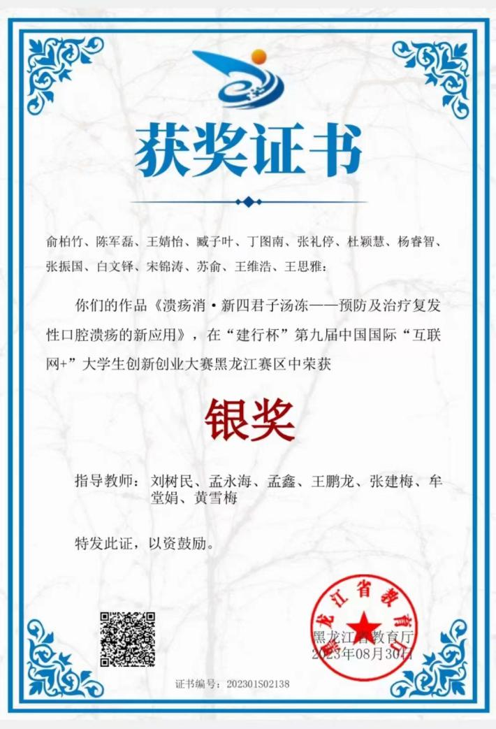 《溃疡消·新四君子汤冻——预防及治疗复发性口腔溃疡的新应用》项目由威尼斯官网学生同黑龙江中医药大学,北京中医药大学,中国政法大学,中南财经大学等校同学联合组队,在威尼斯官网牟堂娟老师以及其他学校老师的指导下共同完成,从多个参赛项目中脱颖而出,并推荐至黑龙江省赛。经过省赛、排位赛激烈角逐,该项目获得第九届黑龙江省“互联网+”大学生创新创业大赛银奖。