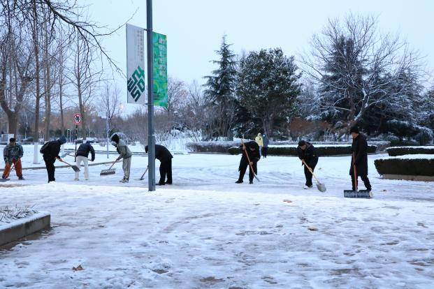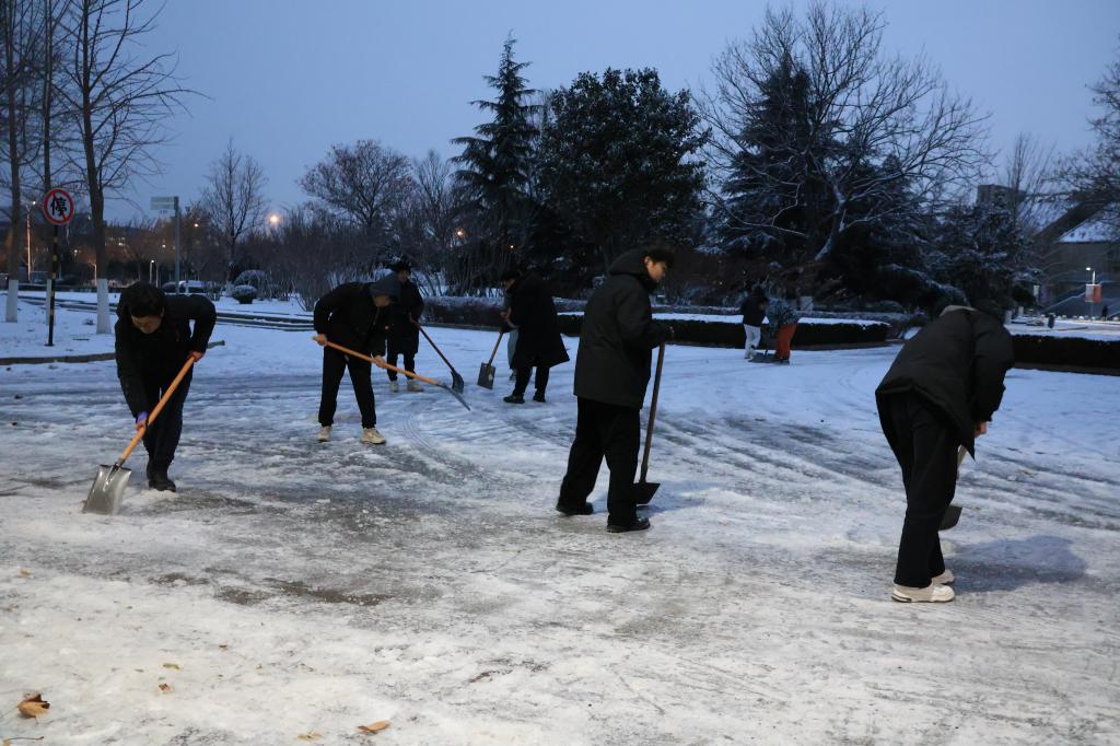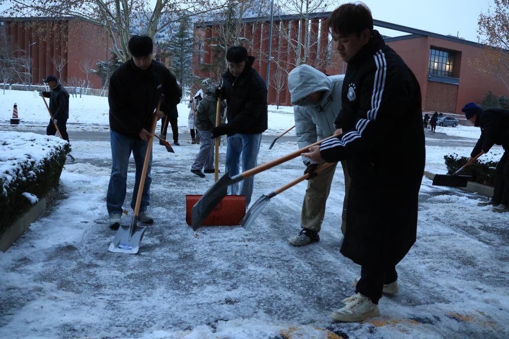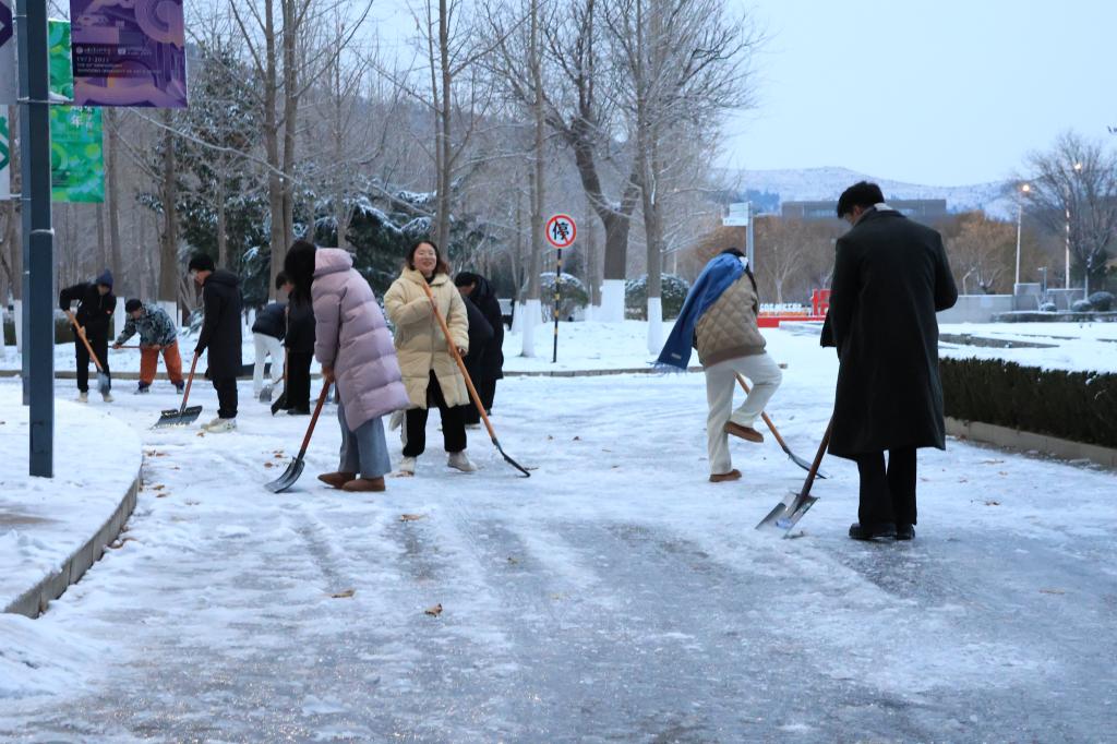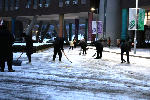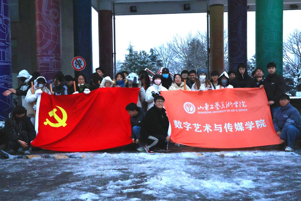 “晨起开门雪满山,雪晴云淡日光寒。”一场冬雪如约而至,为校园装点出了一股“雪霁银装素”的独特韵味。雪景虽美,但也带来了不小的安全隐患,为师生出行、道路安全带来一定的困扰。12月15日下午,数字艺术与传媒学院学生第一、第二党支部组织学生党员和积极分子加入到学校后勤保障处和物业管理人员的扫雪除冰队伍中,充分发挥学生党员与入党积极分子的先锋模范作用,共同为保障广大师生的安全出行贡献一份力量。