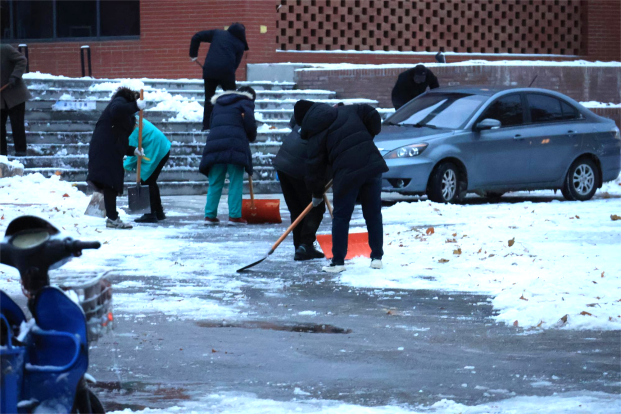下午4点,天空仍飘着轻盈的雪花,同学们在一号教学楼西门集合完毕。同学们默契配合,有条不紊地疏雪、铲雪,齐心协力清理结冰路面。他们充分发扬不怕苦、不怕累的精神,拿着铁锹奋力铲冰清雪,手和脸冻的通红,但这并没有影响扫雪除冰的热情和工作效率,他们冲在前、干在先、战严寒、斗冰雪,分工有序,干得热火朝天,在道路上演奏着“咣咣咔咔嚓嚓”的扫雪除冰“进行曲”,忙碌的身影在冬天凛冽的寒风中构成了一道靓丽的风景线。经过两个多小时的奋战,主要道路上的积雪基本清扫干净,为师生出行清扫出一条“绿色通道”。