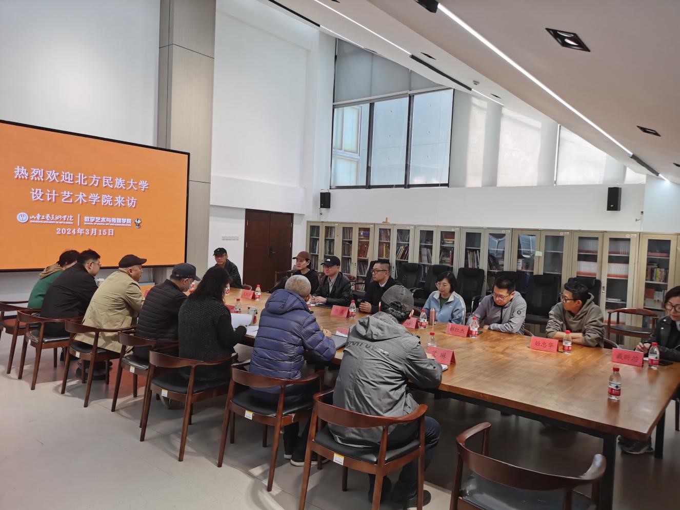 3月15日,北方民族大学设计艺术学院院长苏冠元、副院长陈晨、中国画专业、环境设计专业、视觉传达设计专业、雕塑专业相关教师等一行9人来数字艺术与传媒学院交流考察,数字艺术与传媒学院院长吴向阳接待来宾并主持座谈。根据本次走访相关专业方面的需要,视觉传达设计学院院长王晓峰、建筑与景观设计学院院长李文华、造型艺术学院院长刘宁、相关专业教研室主任参加本次座谈。