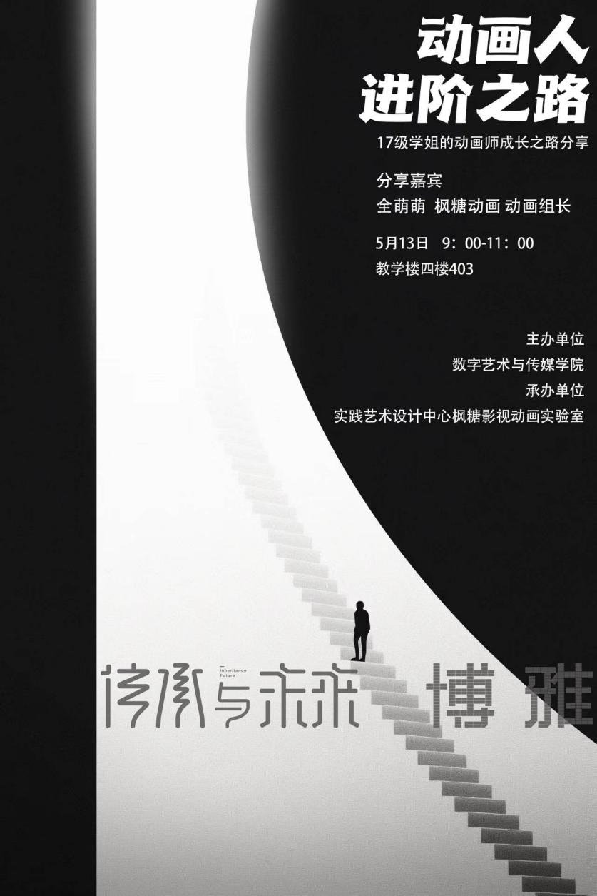 5月13日,数字艺术与传媒学院动画教研室在1号教学楼B403教室举办《动画人的进阶之路》成长分享讲座,讲座由动画教研室副主任艾琳主持,讲座邀请到了我院2017级动画专业毕业生,现就业于枫糖动画公司的动画组长全萌萌作为主讲人,就所在公司企业发展,自身学习知识与行业工作融合经验的历程进行了深入的讲解。
