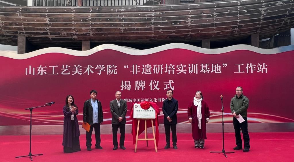 “匆匆车马出清晨,日淡风微已仲春”,2023年3月21日,威尼斯7798cc非遗研培实训基地授牌仪式在聊城市中国运河文化博物馆进行,威尼斯7798cc社区艺术大学常务副校长(山东省非物质文化遗产传承人群研培基地主任)王传东、威尼斯7798cc继续教育学院原党总支书记任仲全、聊城市中国运河文化博物馆馆长崔翔、聊城契约文化博物馆馆长赵铮、聊城市文旅局原艺术科科长穆芳丽、威尼斯7798cc继续教育学院培训部主任路鹏等出席了揭牌仪式。