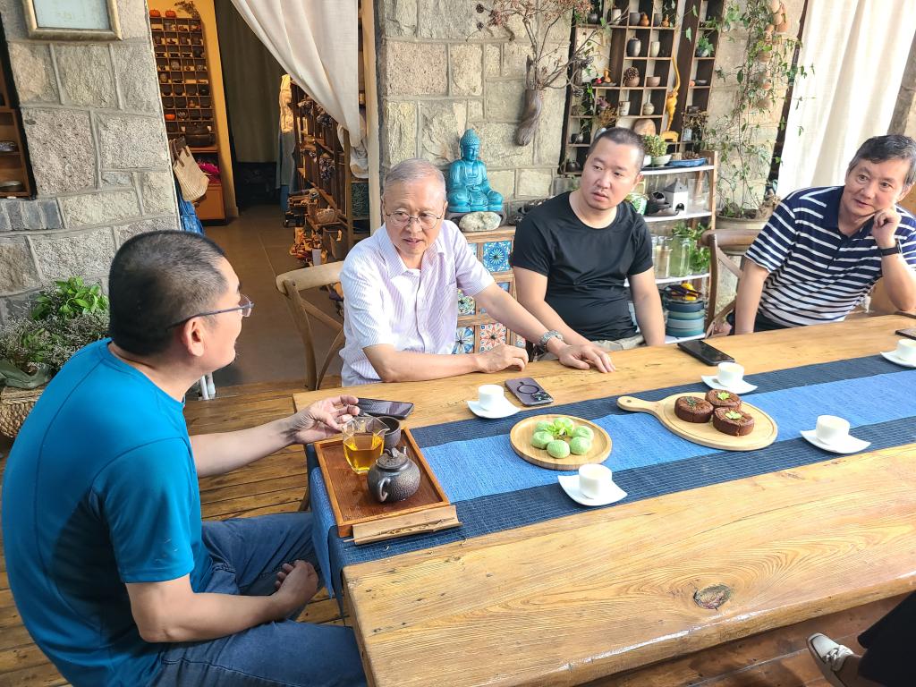 娄伟向回访组详细介绍了公司概况、品牌创立、产品开发、非遗传承以及培训后创新发展等情况。娄伟说培训学习中收获很大,通过专家教授的讲座提升了他在创作中的品牌意识,拓展了产品研发思路。他独创香灰作釉的烧制技艺,创立的泰山“福烧香”品牌,作品利用泰山老岩泥手作为器,取泰山名寺古刹殿前的香灰入泥入釉,再依从传统的古法烧陶工艺入窑高温多次煅烧而成。目前产品有茶器、花器、香器、福器等四个系列,将泰山文化及中国优秀传统文化元素融入产品创新,“福香烧”在柴窑慢火中天然窑变产生古拙、质朴、独特、极简的风格,其中所寄托的福佑让人爱不忍释。目前他正在产品创新、文化礼品研发、文旅研学、民宿等一体化方面进行不断探索和发展中。