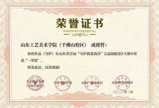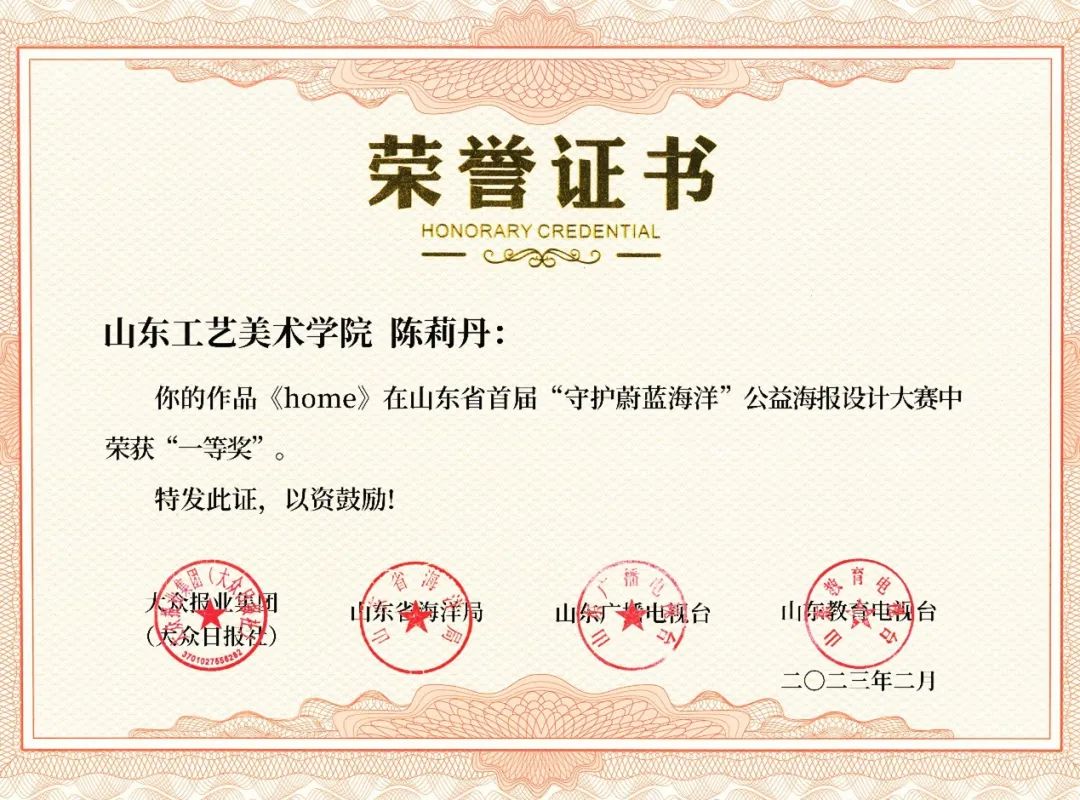 近期,由大众报业集团(大众日报社)、山东省海洋局、山东广播电视台、山东教育电视台联合主办的山东省首届“守护蔚蓝海洋”公益海报设计大赛奖项揭晓,经过经初步评审、网络投票、专家评议、媒体公示等程序,应用设计学院视觉传达设计(印刷方向)陈莉丹同学设计作品《home》及成郅哲同学设计作品《守护》均荣获一等奖,专业教师李凤华荣获“优秀指导教师称号”。