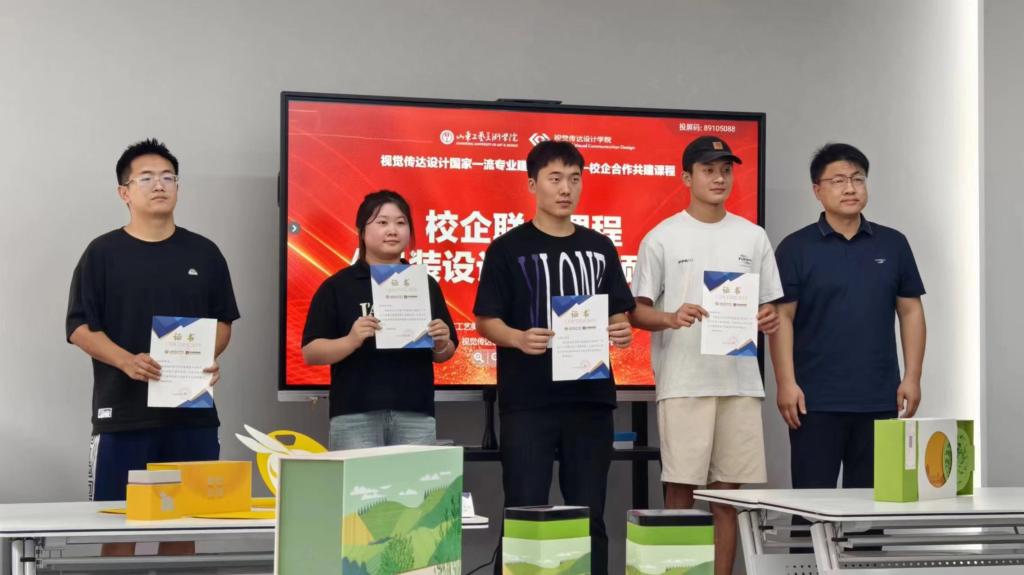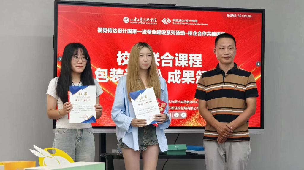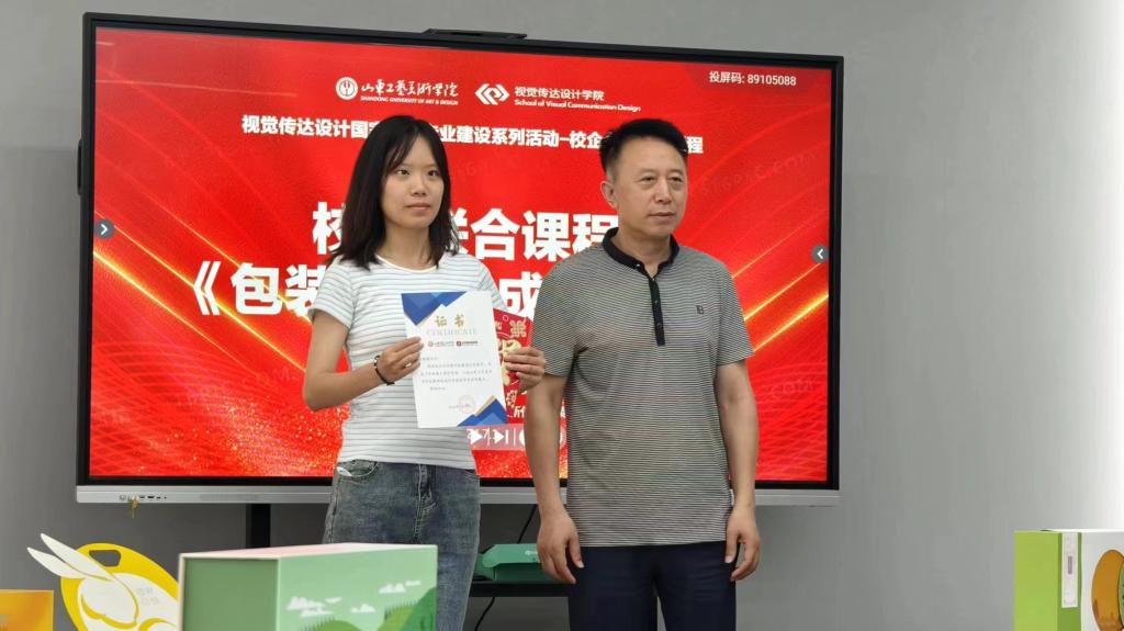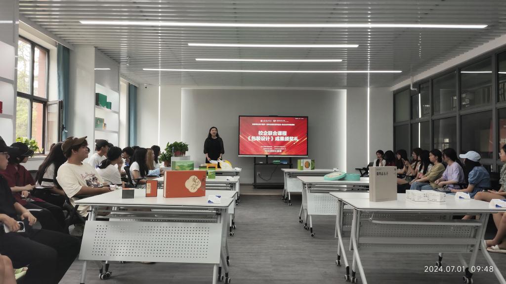 7月1日,校企联合课程《包装设计》成果颁奖典礼在艺术与设计实践教学中心校企共建包装设计实验室举行,艺术与设计实践教学中心主任高振堂,视觉传达设计学院党总支书记林波、副院长张培源、副书记张洁、山东新佳怡包装有限公司设计总监黄雪龙以及包装教研室全体教师和学生出席活动。