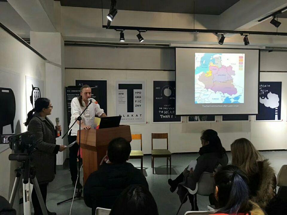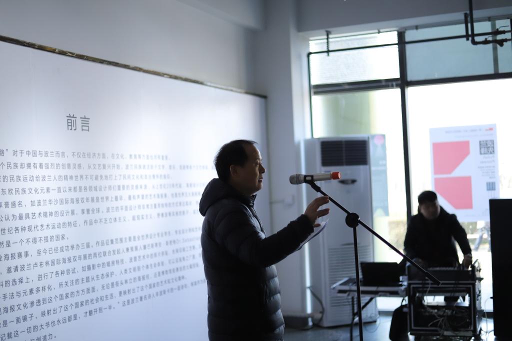 石增泉教授主持展览开幕式,简单介绍波兰为代表的东欧民族文化元素一直以来都是各领域设计师们重要的灵感来源,波兰的海报设计在全世界都享誉盛名。塞巴斯蒂安•斯密特博士表达本次展览举办的荣幸之情,很多人的努力让此次展览的专业性交流成为可能,展览作品有一点回顾性,期待以后可以与学校更多合作。