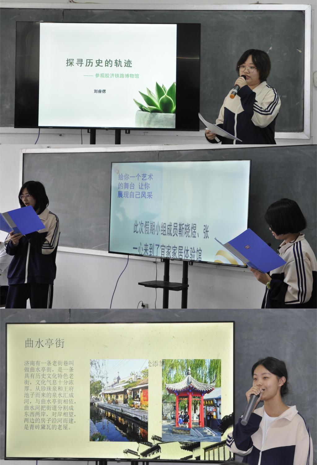 首先进行的是社会艺术实践作品展示。三组同学分别向大家介绍了自己的暑期成果,图文并茂,精彩纷呈。师生和家长们沉浸在济南古色古香的建筑中,感悟着传统文化之美。随后,谷强老师对学生的作品进行了点评,肯定了学生为作品所做的努力,并表达了对各位同学的鼓励和期许。