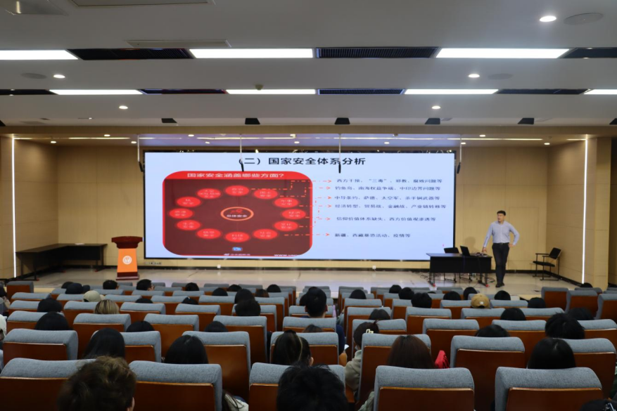 本次讲座的主题是“贯彻总体国家安全观,增强全民国家安全意识和素养,夯实以新安全格局保障新发展格局的社会基础”。授课老师分别从政治安全、军事安全、国土安全、经济安全、金融安全、文化安全、社会安全、科技安全、网络安全、粮食安全、生态安全、资源安全、核安全、海外利益安全、太空安全、深海安全、极地安全、生物安全、人工智能安全、数据安全等二十个方面进行了深入细致的讲解,向师生号召,国家安全就在你我身边,从我做起,从现在做起。