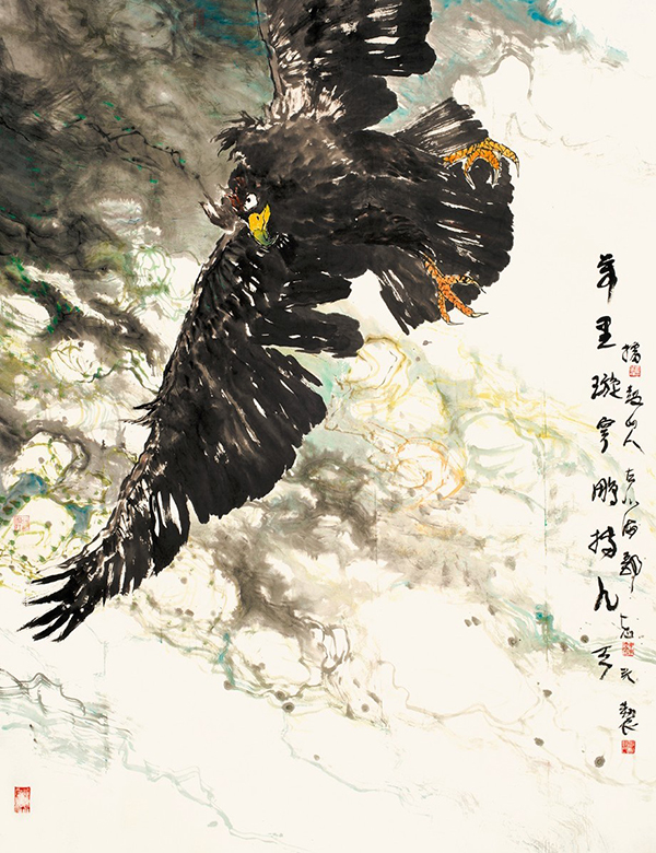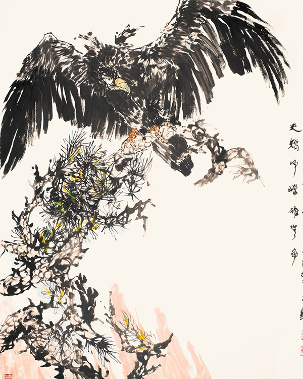 读郭志光先生的作品,首先是大气磅礴、雄健朴茂的精神气象扑面而来,其格调不俗,气派磊落,即使抒写对象平素常见,但整体气势恣意狂放、傲然不群。这种气象源于他在笔墨、造型、构图等诸方面对传统写意花鸟画的继承和自我大胆的突破,并彰显出老、辣、奇、险的独特审美特征。显然,郭志光先生花鸟画呈现出的豪迈、大气师承潘天寿的“一味霸悍”。“霸悍”多从贬义,潘天寿却以“霸悍”自勉,并反其道而用之,追求中国画的大手笔、大气势,彰显出一代花鸟画大家的气魄与胸怀。像潘天寿一样,郭志光先生擅长画大尺幅的作品,在这些作品里,对画面气势的驾驭和控制能力成竹在胸。虽然绘画尺幅的大小与艺术的感染力不具有必然的联系,而仍取决于画家的艺术格调、造型能力、笔墨技巧、人品修养等诸多因素,但他的花鸟画作品突破了折枝花鸟的雅趣,以强烈的主题性给我们以巨大的冲击,呈现的是郭志光先生雄浑气魄、创新技法与个性风格的艺术追求。以传统的工具、笔墨、线条和技巧,借花鸟之形,以激扬的感情掌控如此的画幅,创造如此恢弘的气势,具备如此的艺术感染力,不能不说是郭志光先生对传统花鸟题材与表现手法传承与创新的形象体现。简而言之,以小笔画大画、有大格局见小细节、以传统笔墨见真功力是他花鸟画的重要语言特征。如他鹰鹫题材的作品《悠悠天韵鹫飞来》《远瞩》《鹏跱丹崖》《雄无争》《大风临野》等,画面大都表现在松石上或展翅欲飞、或降落栖息、或高瞻远瞩的鹰与鹫,浓重的笔墨及其动势具有强烈的视觉冲击力。鹰鹫的羽翼或收或展,收放有度、舒展奔放,大块笔墨小笔挥写,一气呵成,墨色整体却通透灵动,点厾见笔不琐碎,笔触之间的微妙空隙和飞白体现了笔墨的变化、层次感和羽毛的质感;头部和鹰爪则刻画细致,其机警灵动的眼神与雄傲的气质,遒劲有力的鹰爪和稳健的姿态更显示出雄霸的气度,而松石树木的搭配更使整个画面坚毅挺拔,暗含着蓄势待发的气势。还有《紫气东来》《长愿相随》《桃园起舞》等这些作品,不仅是猛禽巨石、松鹤熊猫等大题材,画幅也多为五米有余,而行笔书写却笔笔见力,绝无平淡雕琢之气,这不仅是立意构思的高远,心胸气度的宏阔,还是笔墨功力的显现,这显然是他长期传统笔墨实践的结果。