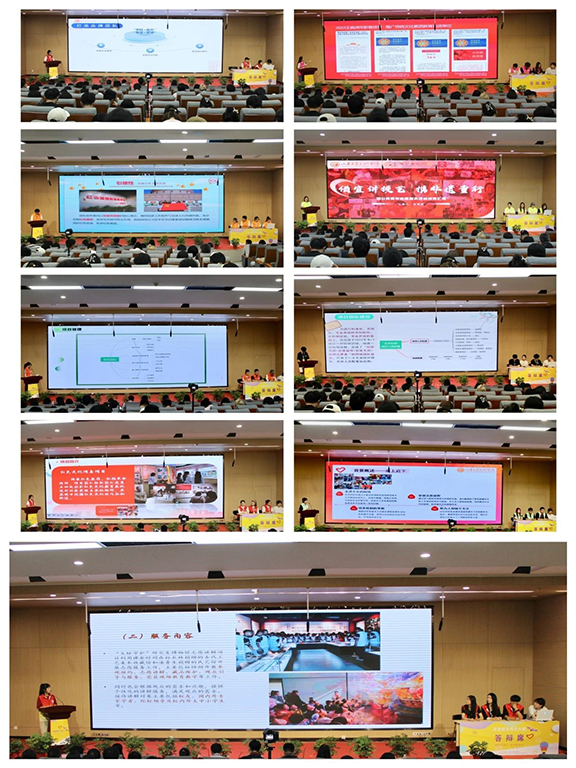 本次大赛以“青春志愿行,建功新时代”为主题,自4月启动以来,在全校范围内征集到33支项目团队的申报材料,项目涵盖乡村振兴、文化传播与旅游服务、文明实践、为老服务、关爱少年儿童、环境保护、阳光助残、社区治理与邻里守望等8个项目类别。经过初期申报材料评审、公益集市路演环节,9支参赛团队进入校级决赛。决赛以PPT汇报、现场答辩的方式进行,各参赛团队集中展示了志愿服务项目的内容以及志愿服务活动的精彩瞬间,分享了各自团队的志愿服务故事。五位评委从目标明确、管理规范、成效明显、善于创新、影响广泛五个方面进行评估打分。