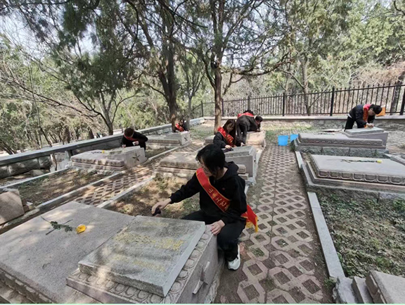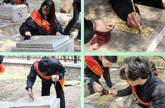 青年团员们满怀敬仰与感激的心情来到烈士墓碑前,墓碑上的每一个字都经过精心雕琢,仿佛在诉说着逝者一生的故事。它们静静地矗立在那里,见证着岁月的流转,成为永恒的记忆。同学们细心地为烈士墓碑擦拭尘土、描绘金色铭文,每一次轻柔的擦拭、每一笔精确的描金,都使同学们深切地感受到了烈士们英勇牺牲的崇高精神。