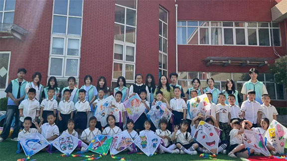 (图:志愿者与小朋友们一起手持风筝合影留念)