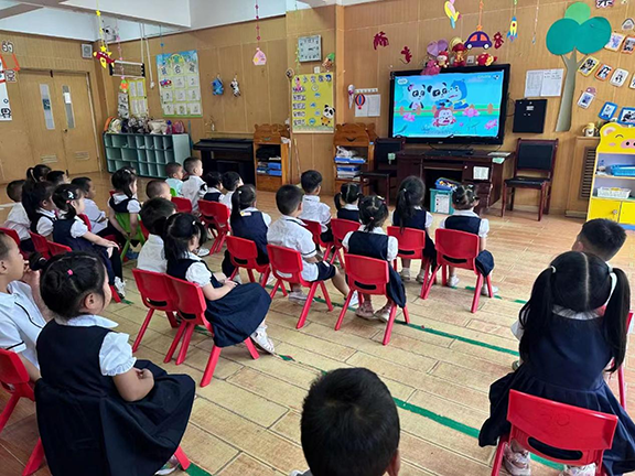 (孩子们认真观看防溺水安全教育动画片)