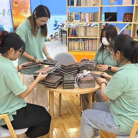 随后,团队一行来到滕州市青年之家亲身体验非遗拓印。一页页宣纸从拓板上揭下,仿佛是揭开了非遗拓印的历史面纱;一道道朱砂墨刷上宣纸,更像是青年学子谱写非遗传承浓墨重彩的一笔。每一张拓片的制作成功都饱含了老师同学们对于中华传统文化的热爱和对滕州善国匠心的尊崇。