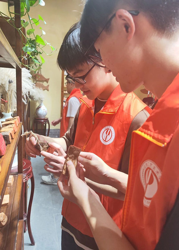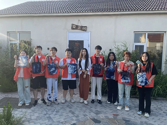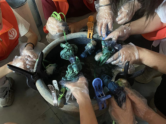 最后,团队一行来到了草木植物染色非遗体验坊,植物染色工艺是一种古老且环保的染色方法,主要利用植物的根、茎、叶、果实等部位提取色素来给织物着色,不仅具有丰富的历史背景,还因其环保性和独特的美感而在现代重新得到关注。在体验坊,传承人详细地介绍了各种植物的染色特性和方法技艺,团队成员切身体验草木染色,运用捆、扎、包等方式做好即将浸染的帆布包雏形,再投入染缸染色,最终清洗晾干。这次体验不仅是一次知识的学习之旅,更是一场感受非遗文化魅力与价值的洗礼,让他们对传统文化有了更深的理解和尊重。