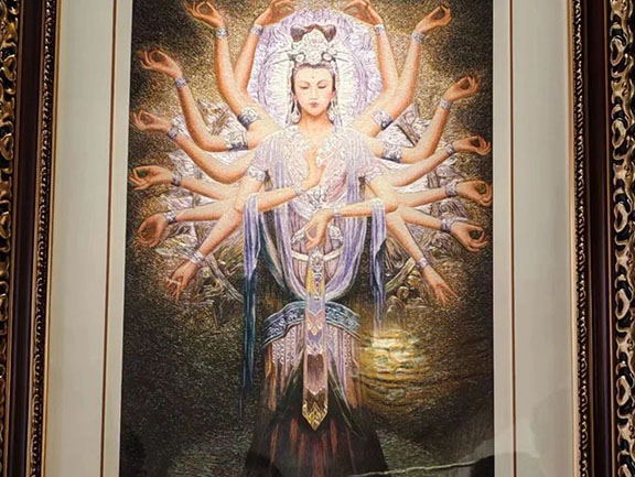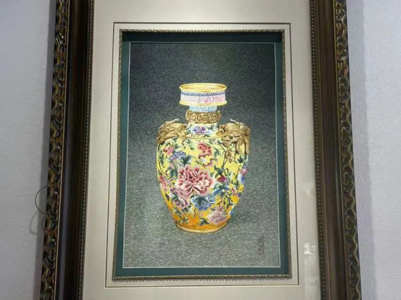满绣是国家级非物质文化遗产,其绣品细致精巧、色彩艳丽、景色逼真,既具江南刺绣的柔美,又有北方人粗犷豪放、大气磅礴的性格特点,被誉为“刺绣中的油画”。它的制作技艺精良考究,艺术风格散发着浓厚的乡土气息。团队走进东营市文化馆“非遗赋能东营,满绣书写华章”特展,满绣第五代非遗传承人蒋老师为成员们讲解了刺绣的蚕丝种类、针法种类,并观赏了传承人及艺术家们的精美作品。队员体会到满绣制作的复杂工艺和高超技艺,对工匠们的精湛手艺和敬业精神表示钦佩。