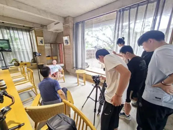 汇泉桃花岛景区是沂河源田园综合体的核心区,这里的艺术是造福乡村的艺术,是“艺术活化乡村”在本土的成功实践。沿着炊烟的轨迹,志愿者的镜头里出现了一处饱含历史的村落,时间之花、乡村记忆……一个个充满艺术气息的路牌映入镜头,18个文学类艺术馆分布在桃花岛周围的乡村中,它们全部由一座座闲置的老房子活化而来,外部仍保留着传统民居的样式,让乡村成为了艺术的栖息之所,艺术化作为乡村的璀璨明珠,相互辉映。志愿者们有幸与到此参观的艺术大家冯博一、毛同强老师进行友好交流,采访了他们关于艺术赋能乡村振兴的看法。正如冯老师所说的“乡村艺术馆根据当地的人文、空间布局而发展出来,将现代艺术与乡村风俗有机结合,于乡村振兴而言,这种艺术文化元素在乡村中扎根发展,对当地的文化生态有一定的积极影响。”采访的过程也是学习的过程,志愿者们深刻感受到艺术家们在继承、弘扬艺术文化的同时,也在通过结合乡村生态、当地文化、现代审美和科学技术,对中华优秀传统文化进行创造性转化、创新性发展,因地制宜创新文化发展的新形式。乡村为艺术提供了无尽的灵感源泉、丰富的创作素材以及多样的风格形式,在这里,艺术得以更宁静、质朴和纯真。