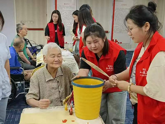 实践活动伊始,团队成员们耐心地向老人们介绍漆扇制作的流程。在同学们的帮助下,老人们纷纷拿起画笔,轻蘸颜料,在扇面上勾勒出心中的美好图案。其中,有老人以鲜艳的五星红旗为题材,深情表达对伟大祖国的无限热爱。通过重绘青春记忆,让那段珍贵的时光在扇面上得以永恒定格,以漆扇为本见证了红色精神与传统文化完美融合。