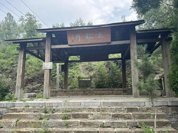 方案四采用了五眼井村特色的五眼井为主体,由于五眼井村四面环山的地理位置,因此加入了手绘山的图像。同时采用了五眼井村中的戏台以及历史老院子门外的向日葵图案。选用代表生机深绿色与淡雅的米白色作为主色调。深绿色寓意着产品的活力与健康;米白色则给人以纯净、柔和之感,营造出温馨舒适的视觉氛围。