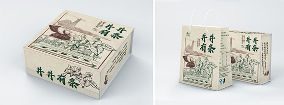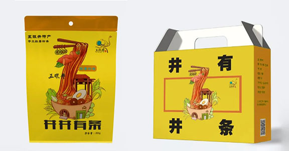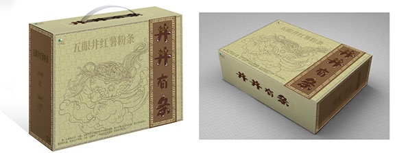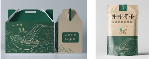 方案一主色调为土黄色,强调农业的重要性。产品名称“井井有条”采用字体设计,“井”字笔画变换为五眼井红薯粉条的原材料:红薯。能够使消费者准确定位到该产品的地域属性及产品内容,迅速锁定产品优势。作品主要图形以线描的形式表现刚出锅的粉条,祥云纹和水波纹做衬托;作品以波浪文字效果为背景,增减包装整体的趣味性;以简短的文字介绍五眼井村子的起源,能够让消费者快速了解五眼井村的特色。