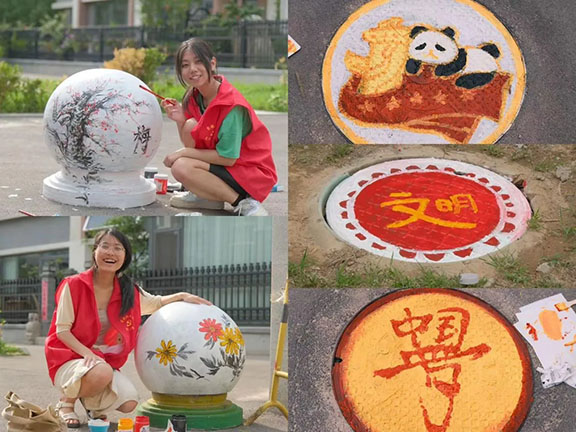 一彩一晕添秀色,一笔一画绘文明。团队成员在绘画时深入挖掘主题彩绘的艺术价值,力求在满足社区美化要求的基础上展现出更高层次的艺术魅力。此次井盖彩绘活动不仅是一次艺术的实践,更是一次文化传播和文明创建的行动。团队成员通过发挥自身专业优势,将红色精神传播至社区的每一个角落,激发了当地居民对美好生活的向往与追求,同时也促进了学生与社会之间的联结,深刻领悟了中华文化的独特魅力。