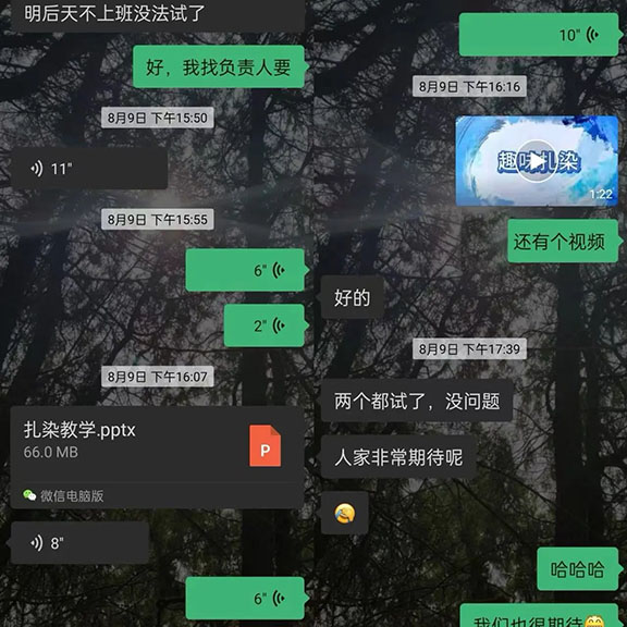 在确定好地址后,积极与幼儿园老师们沟通交流,编写敲定此次扎染教学的策划案,在幼儿园园长及班级老师细心阅读后,认可支持此次教学,并和我们协商时间,定于8月12日进行,同时我们团队进行采购所需材料,确保非遗课堂的顺利开展。