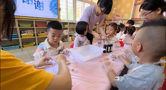 选定济南市市中区的尖尖角幼儿园,进行非遗扎染教学,旨在宣传发扬扎染文化,为中华优秀传统文化的传承献出一份力量。
