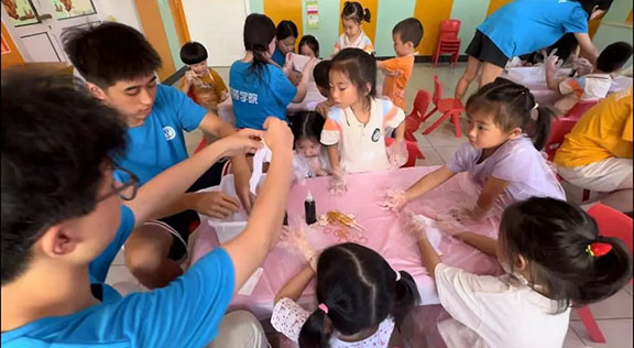 队员们为每一位小朋友穿上了围裙及手套,防止弄脏衣物和小手;将材料下发后,队员们分成四组,开始耐心地带领小朋友们制作扎染作品,细心询问小朋友们想要制作的图案,手把手地帮助小朋友们进行创作。