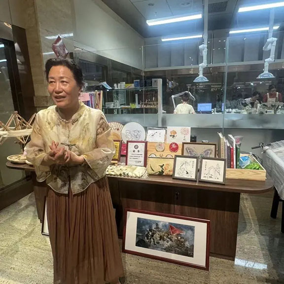 -宋爱华老师:中共党员、鲁绣省级非遗代表性传承人、山东省工艺美术大师、山东省工艺美术名人、首届山东手造工匠,曾在国内多省举办鲁绣展,并赴法国、韩国等国举办鲁绣展及进行文化交流,为鲁绣藏品的保护、鲁绣文化技艺的研究和传承做出过重要贡献。(上图为宋爱华老师介绍鲁绣历史以及回答同学们的问题)