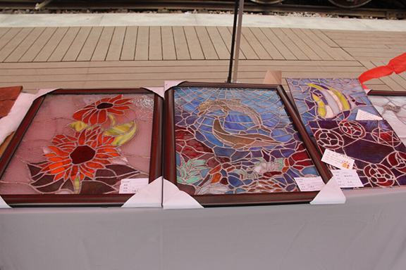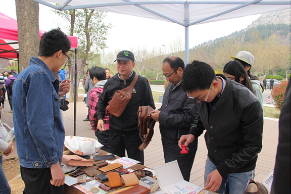 随后,丁书记与老师们来到设计师广场中心的火车头的“创意集市”活动现场。 “创意集市”是一个提供给同学们展示和交流自己创意产品的街头摊位集市,摆卖自己创意制作的货品。各种琳琅满目的商品带来的感动,带来的热闹足以为摊主接下来的发挥奠定基础。数字艺术与传媒学院的作品有牛皮背包、钱包,牙签模型、牙签优盘、金丝沙画、手工耳钉和手工发卡等,同学们利用各种材料做出了许多让人意想不到的作品,创意新颖,吸引眼球,展示出了当代大学生的艺术创意潜能。