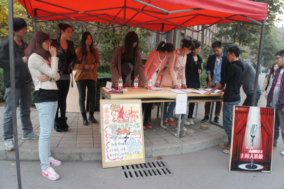 10月19日,第九届“火焰杯”校园歌手大赛主持人选拔报名在长清校区十字路口顺利进行。负责本次主持人选拔现场报名活动的是校学生会文艺部。