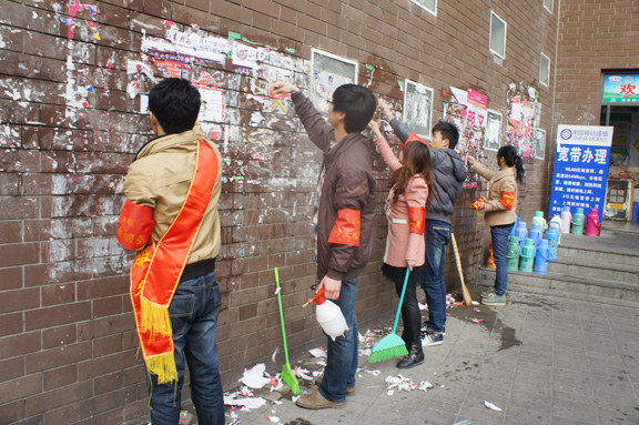 本次活动是对雷锋精神的深一步宣传与弘扬,是同学奉献爱心的体现。所有活动人员在设计师广场集合,同时每位参加活动的同学都佩戴了“为同学服务”的礼带和袖章,热情投入到活动中去。参加活动人员共分成三组,分别清洁食堂、水房、海报横幅残留痕迹。通过同学们的共同努力,墙壁渐渐显出原本的风采,整个活动过程中,使我们感受到新一代大学生的风采!