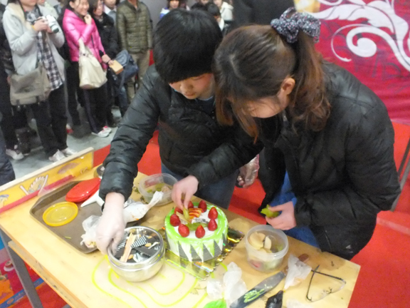 比赛伊始,现场气氛十分活跃,选手们都在精心的准备着自己的作品。现场进行了观众互动,观众通过削苹果、回答关于蛋糕知识的小游戏可获取精美小礼品缓解现场比赛的紧张气氛。让观众们参与到有趣的活动中来。随后,两场比赛的代表队都完成了各自的作品,一个个精致、绚丽的蛋糕呈现在大家面前,选手对自己作品进行了描述,作品的名字主题都富有不同的寓意,体现了选手们各具特色的思想和愿望。作品得到评委的点评与肯定。