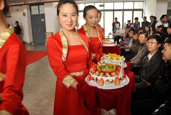 比赛开始后,10支代表队依次出场。为了缓解比赛现场紧张的气氛,现场进行了观众互动活动,观众通过回答关于蛋糕的知识,讲述关于蛋糕的典故而赢得奖品;也让我们进一步了解蛋糕的非凡意义。接着进行了脚踏报纸活动,此活动充分体现了同学们的合作精神,同学们精彩的表演,赢得现场观众的阵阵喝彩和掌声。