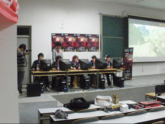 大赛时间将近,第二阶梯教室人头攒动,每个人的脸上都透露着期待的神情。这次比赛的内容是大家都熟悉的游戏:CS。比赛以小组对抗方式进行,五人一组,两组对战。计时开始以后,选手们顺利进入游戏,参赛选手们的左手不停的敲击键盘,移动方向,转换武器;右手紧握的鼠标化为锐利的武器,射向对手。参赛选手们的眼睛紧紧盯着电脑屏幕,对手的一举一动尽入眼帘,不遗漏任何蛛丝马迹;小心防守,不给敌人留下任何反抗的机会,他们的每一个动作都透露着无比的纯熟和稳重。与此同时,各组的成员之间也默默地交流,凭着强烈的团队精神和无言的默契共同击拜强大的对手。选手们认真的投入比赛,而观众也不时为他们加油助威。