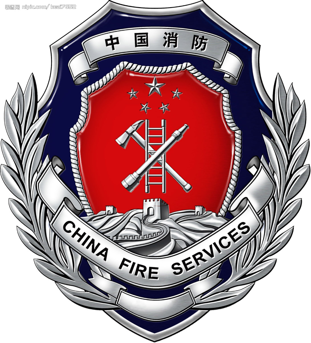 中国公安消防徽标:作为仅次于国徽的国家建制设计,中国公安消防徽标要体现中国公安消防的性质,徽标中间的“消防斧、云梯、水栓”具有很强的行业识别性。消防用绳与其内部勾勒出的红盾一起来代表消防中的“消”字;而“防”字则由整体的蓝盾与象征防御的钢铁长城共同担负。“盾、国旗、长城”的组合构成了“共和国之盾”的内涵,寓意消防部队是中国公安部队的重要组成部分。“消防斧、云梯、水拴”的交叉是世界通用的消防符号,体现了国际化和专业化。而“橄榄枝”象征了和平和美好的生活,更是世界通用的符号。徽标庄重大方,主题突出,具有很强的识别性,体现了中国公安消防无私奉献的精神;体现了以人为本、服务社会的信条,具有民族性和感召力。