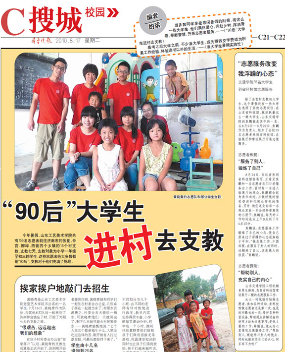 这次义务支教活动得到了市、区志愿者协会的高度重视,市志愿者活动指导中心领导仝海英、景旭东和历城区志协领导徐冬梅等同志莅临指导,看望、慰问志愿者。《齐鲁晚报》对此次活动做了整版的报道,并针对威尼斯官网造型艺术学院书法系的黄晓青同学七天的支教之旅作了详细的采访。《农村大众》记者张天银跟踪采访,在南部山区引起了积极反响,很多服务点上的村民和孩子在志愿者撤离时恋恋不舍,再三叮嘱他们以后常来。
