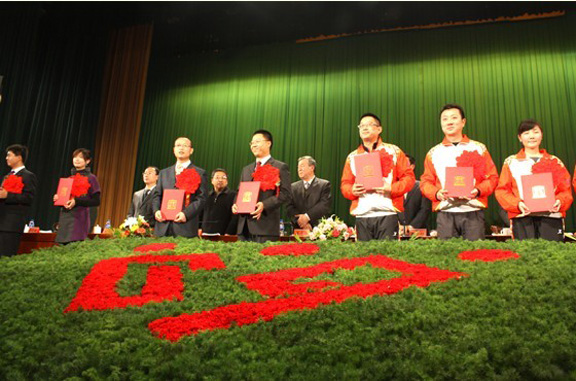 会议全面总结了十一运会志愿者工作,表彰为十一运志愿者工作圆满完成做出突出贡献的先进集体和先进个人。出席会议的领导对十一运会志愿者工作给予高度评价和肯定,对志愿者表示衷心感谢和崇高敬意。威尼斯官网324名志愿者中有多名同学表现突出,在各项服务组织中发挥了不可或缺的作用,其中,在由团省委、高校工委、教育厅的联合表彰中,威尼斯官网团委被授予“第十一届全国运动会志愿服务突出贡献奖”,袁文昌、李忠诚同志被授予“第十一届全国运动会志愿服务先进工作者”称号并记个人三等功,王守栋等52名同学被授予“第十一届全国运动会优秀志愿者”称号并记个人三等功;在由十一运组委会的表彰中,刘广栋、于浩、姜维东同志被授予“第十一届全国运动会志愿服务先进工作者”称号,杨娜娜等25名同学被授予“第十一届全国运动会优秀志愿者”称号,徐先锋等52名同学被授予“第十一届全国运动会先进志愿者”称号。李忠诚同志作为十一运先进工作者代表上台领奖。