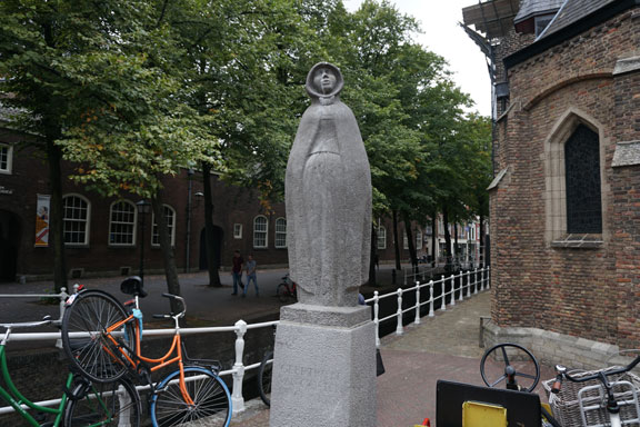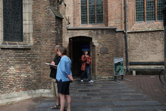 代尔夫特老教堂内有一块弗米尔的墓碑(图4.)。这是许多游客来代尔夫特最重要的目的地之一。墓碑底下就是弗米尔的尸骨。教堂的左侧有一个小门(图5),从这里才能进入到老教堂里面。门口有一个雕塑(图6.),非常有特色。