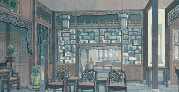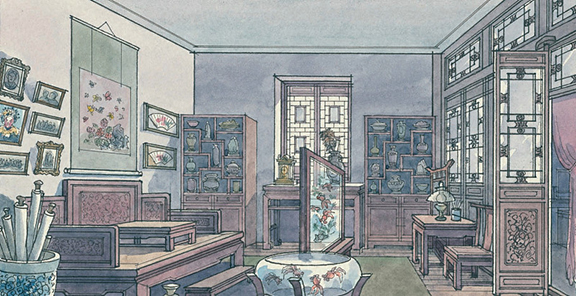 设计这些场景要先研究原著。电影《红楼梦》是北影拍的,我们准备了两年,拍摄了三年,前后一共五年。两年筹备期间研究原著,从里边摘有关布景、服装、道具的描述,写得很清楚,分门别类建立卡片,根据卡片再进行设计。首先设计的就是大观园,电影里大观园的戏特别多。根据曹雪芹的描述把场景设计出来,我花了很长时间,因为得把三大部都读完。