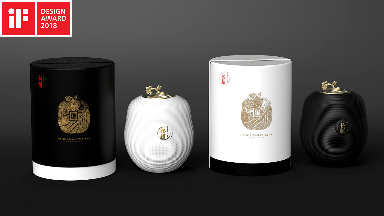整个视觉形象是通过对茶园生态环境的具象描绘,用素描绘画的形式将、茶山、茶树、茶叶组合成一个完美的茶叶陶罐,陶罐顶部也巧妙的结合出一片茶园的形态,黑白两色分别代表着松颜的白茶与黑茶两大品种,用简单直观的手法传递出松颜茶叶的品牌特色