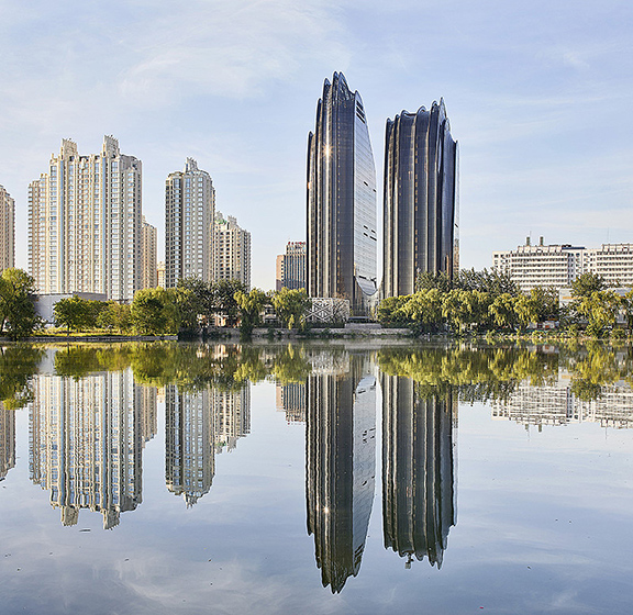 马岩松和他带领的MAD建筑事务所历经6年,近日完成了“墨色山水”——朝阳公园广场及阿玛尼公寓建筑群。地处北京朝阳公园的南面,建筑群总建筑面积约22万平方米,由10座建筑组成,高低错落,好像一幅展开的山水画卷,又像是一组盆景。不同于纽约中央公园边上那些强调边界围合感的现代建筑,北京这组极具未来感的建筑更加强调自然向城市的延伸和渗透,将城市中的人造物“自然化”,运用中国古典园林建筑中“借景”的办法,突破了朝阳公园与城市的界线,使自然和人造景观交相辉映,使人融情于景。